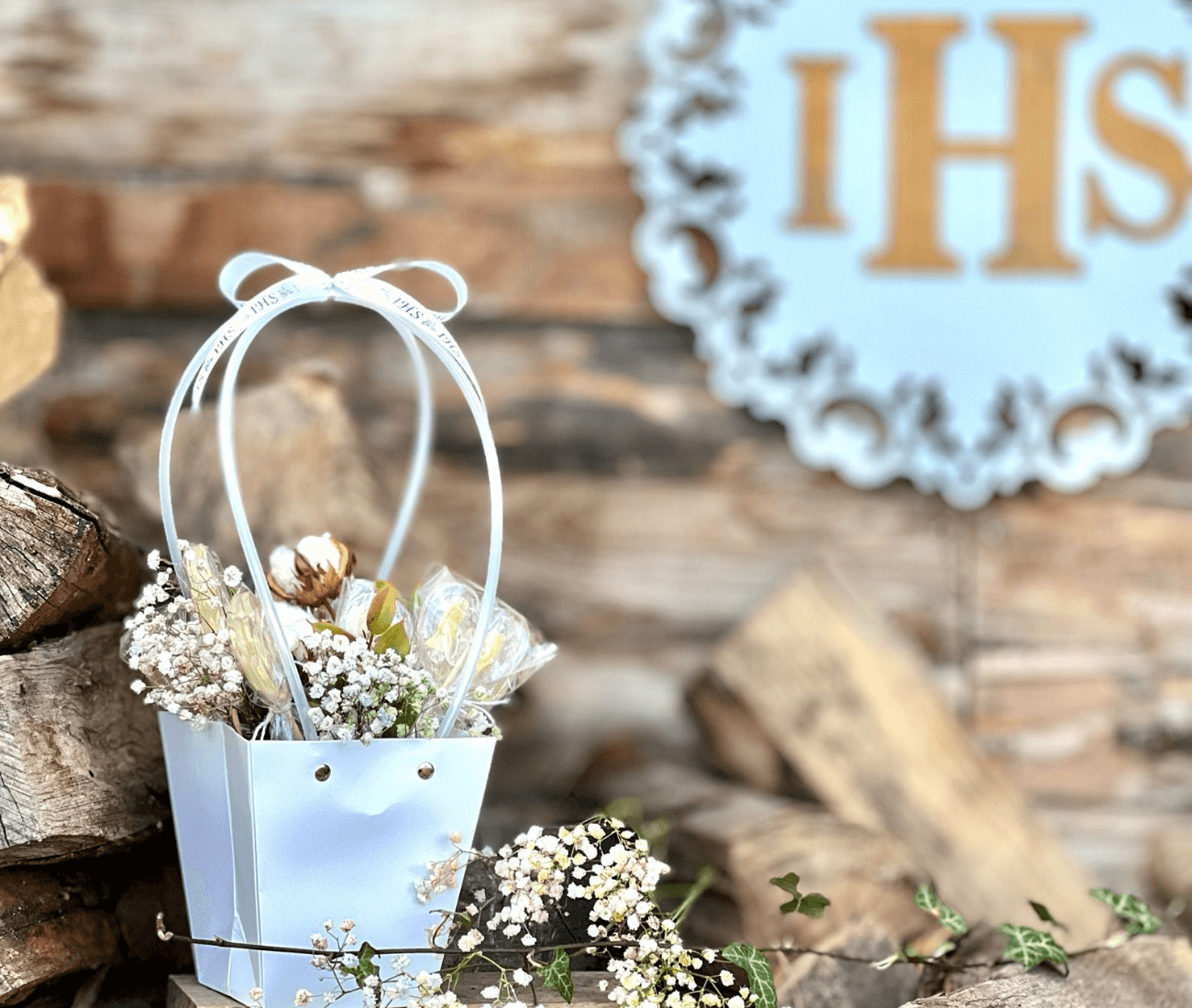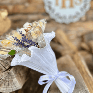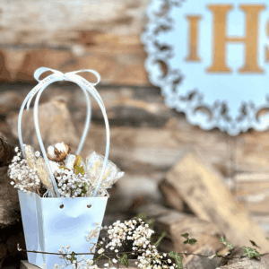 Komunijny zestaw lizaków w jasnych kolorach. Może służyć jako prezent z tej ważnej okazji albo ozdoba stołu, z której goście wezmą później do domu pamiątkową słodycz na patyku. 4 małe i 4 duże lizaki wraz z ozdobami bukieciarskimi mogą być umieszczone stabilnie na gąbce florystycznej w białym torebko-koszyku, lub w formie bukietu otoczonego krepiną.